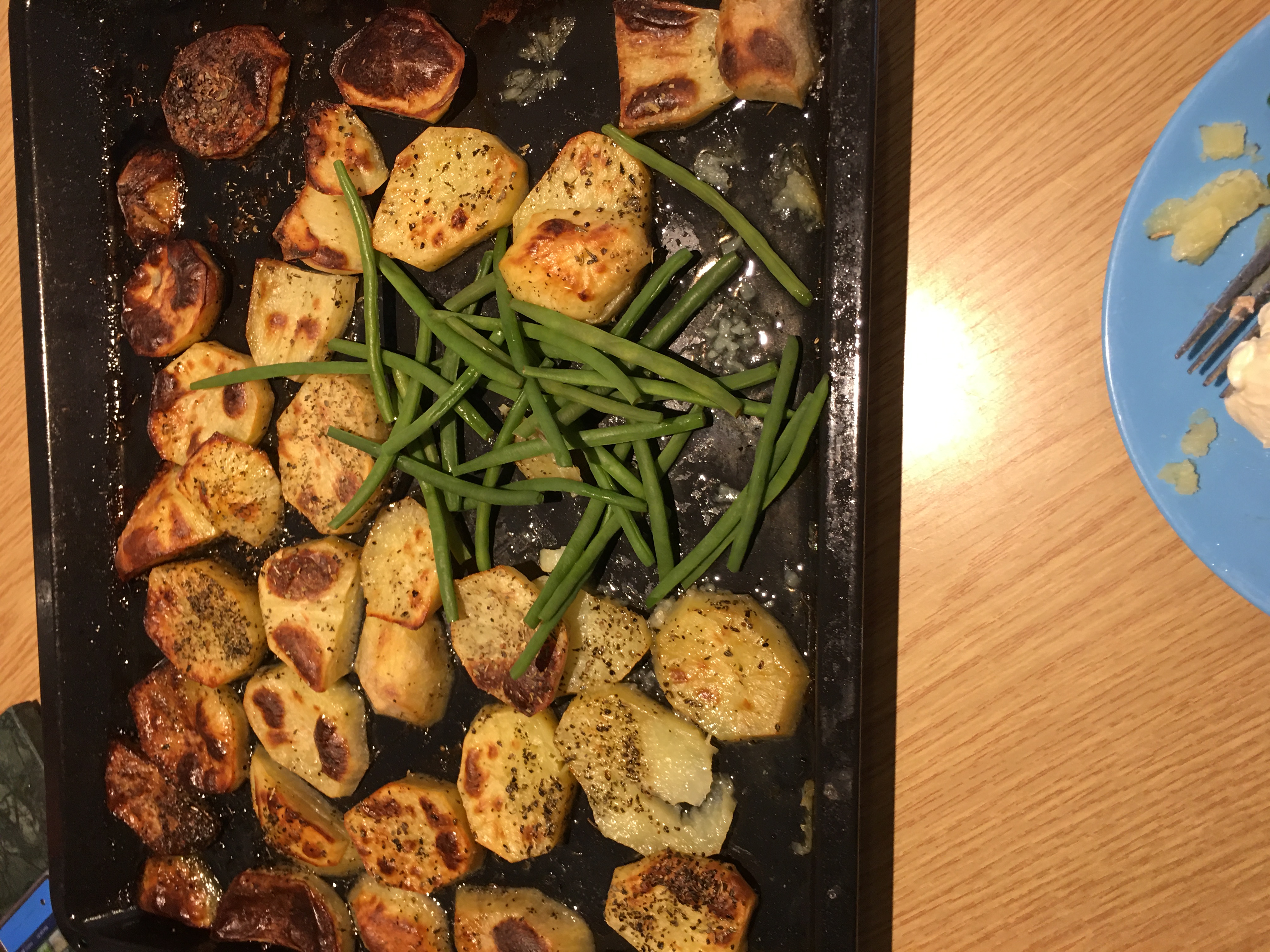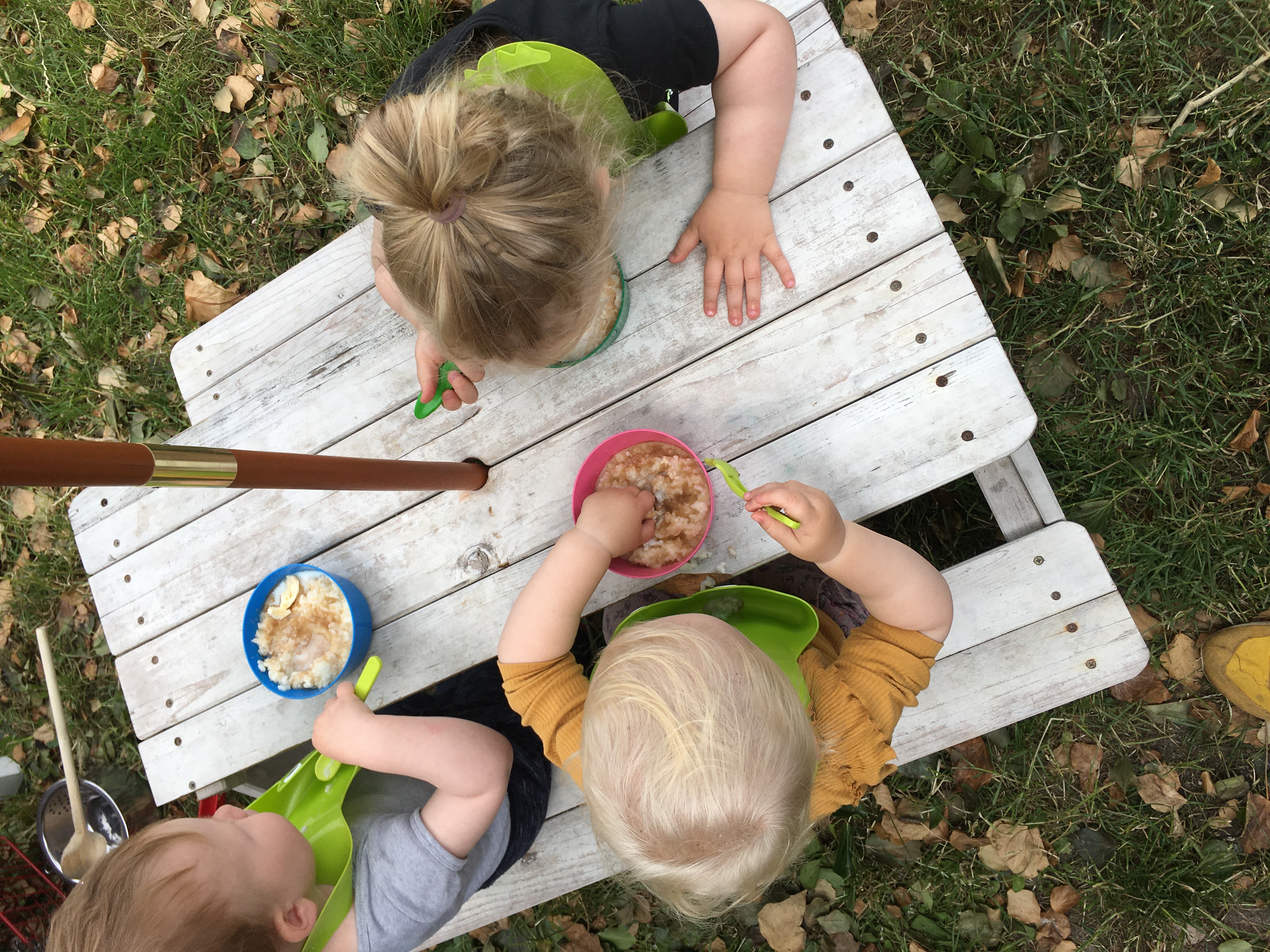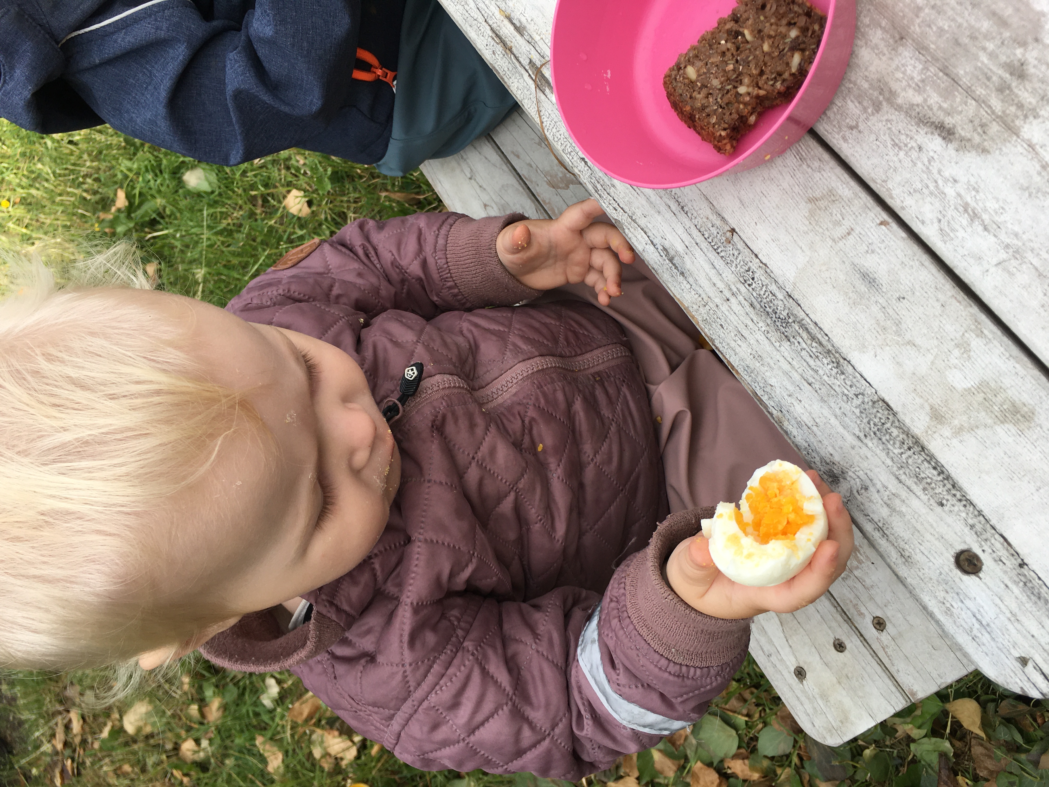 Vi vasker hænder, sætter os til bords og spiser økologisk frokost med masser af grønt. Er vi ude har vi madpakker med.