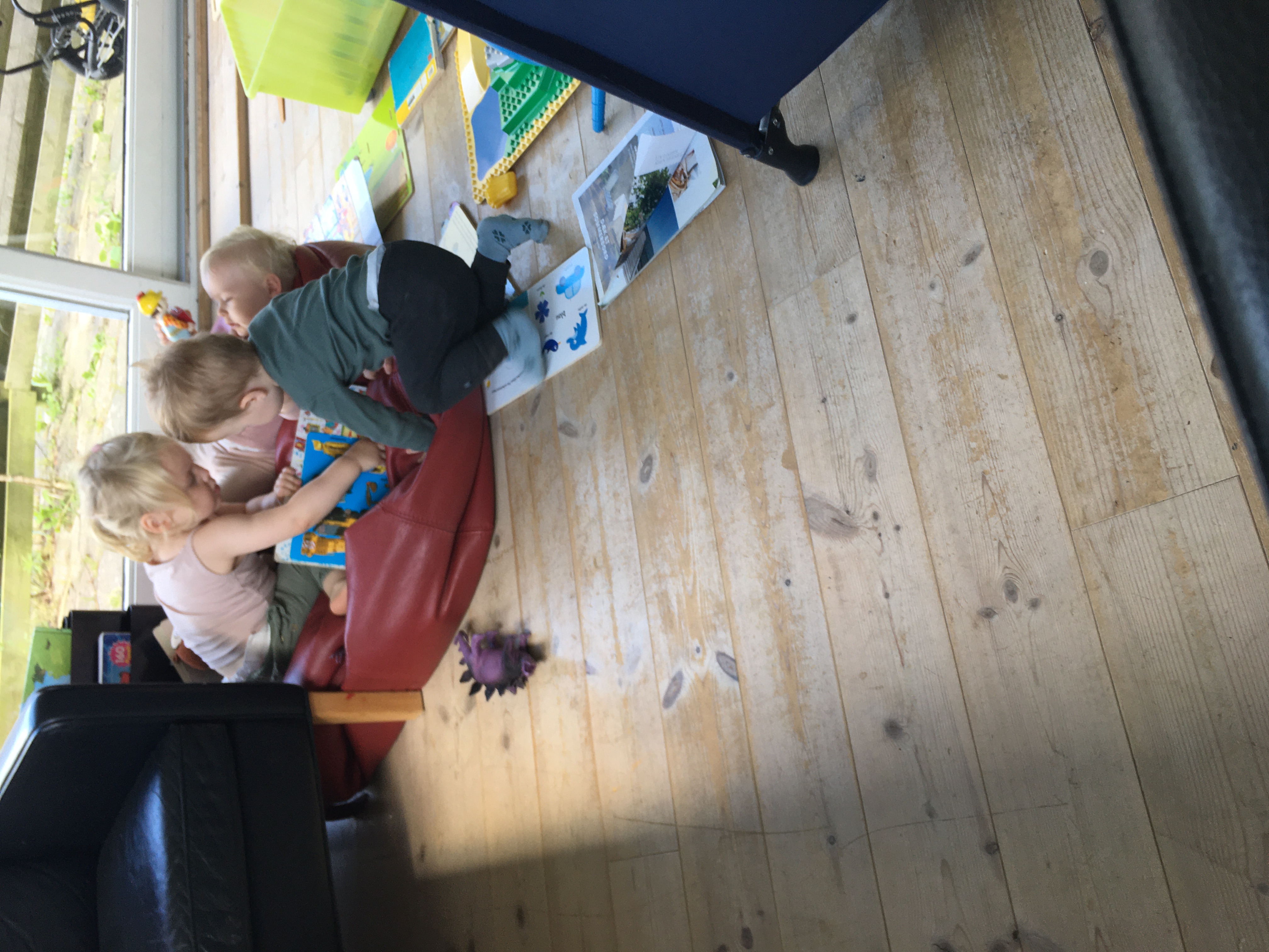 Fri leg indenfor eller på gårdens legeplads. Vi laver ofte en samlet aktivitet som højtlæsning i hyggehjørnet, eller laver sprogtræning med ipad eller samtalekort, tegner, eller lave finmotoriske leg med pomponer og skeer eller laver flotte kollager sammen. Ofte er